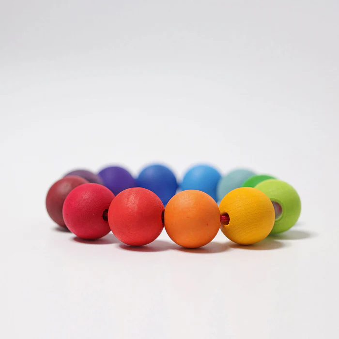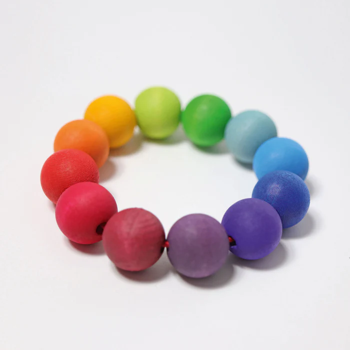 En pärlring i regnbågens färger som är lätt för små händer att hålla i. Passar fint för tidig lek och utforskande.