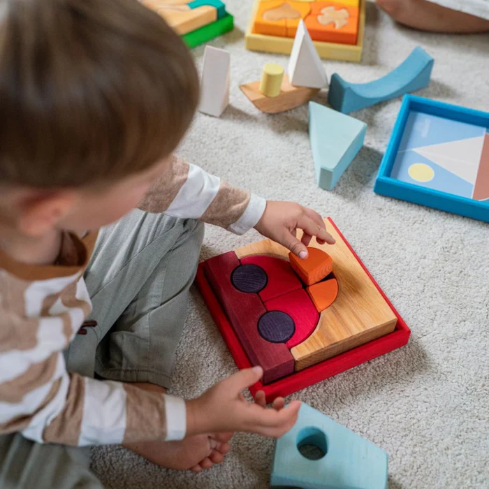Ett rött träpussel av en bil. Delarna kan läggas i ramen som ett pussel eller plockas ut och byggas med fritt i leken. De stora bitarna är lätta för små händer att greppa.